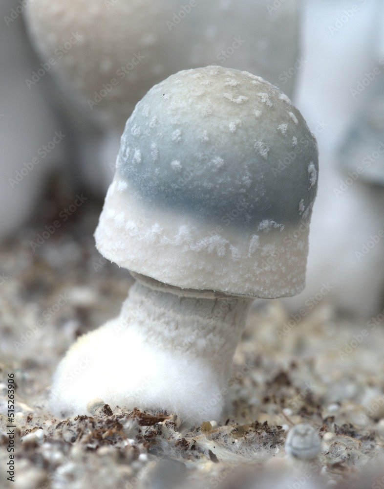 Albino Penis Envy mushrooms are shaped like phalluses but are small in size with white stems and light blue-tinted caps.