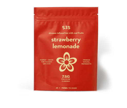 The S35 Strawberry Lemonade Mushroom Tea uses golden teacher mushrooms, hibiscus, currants, pineapple pieces, black tea, strawberry flavoring, and stevia leaves.